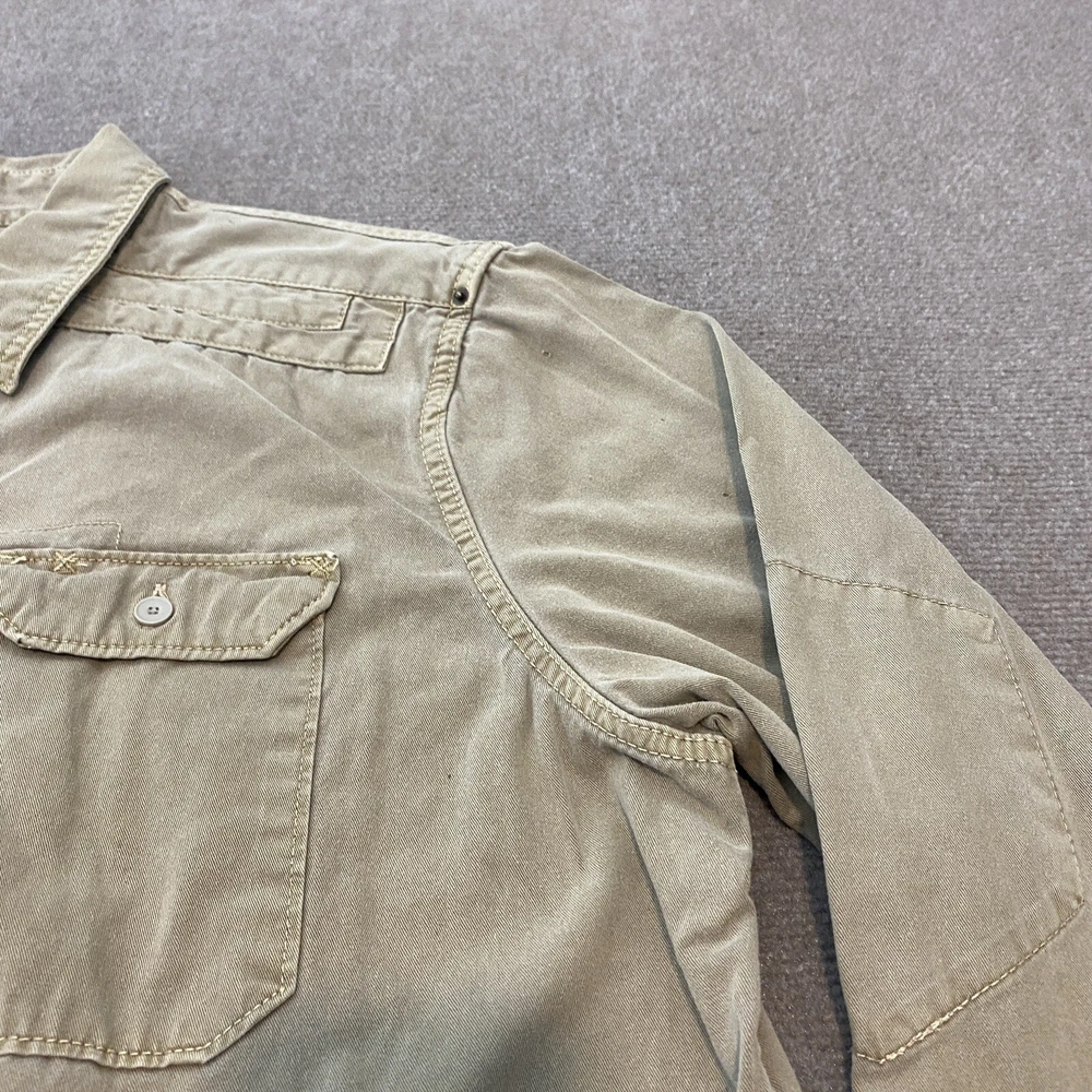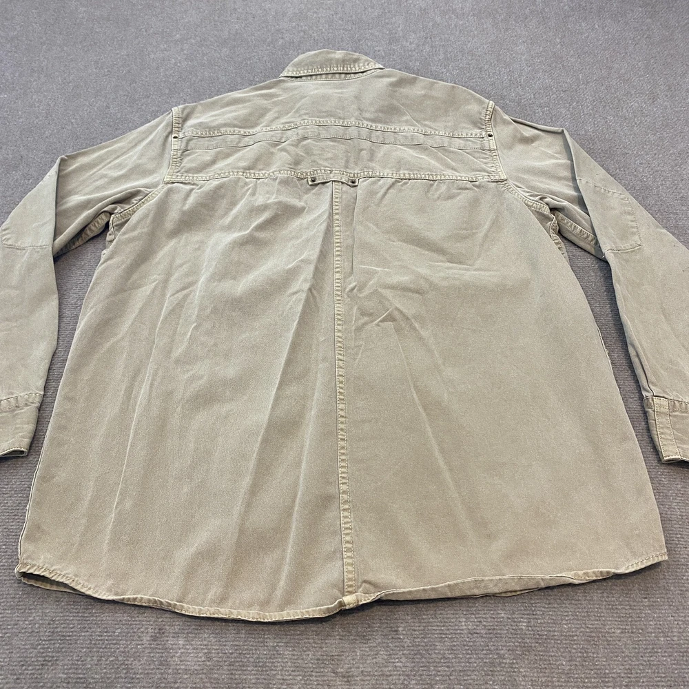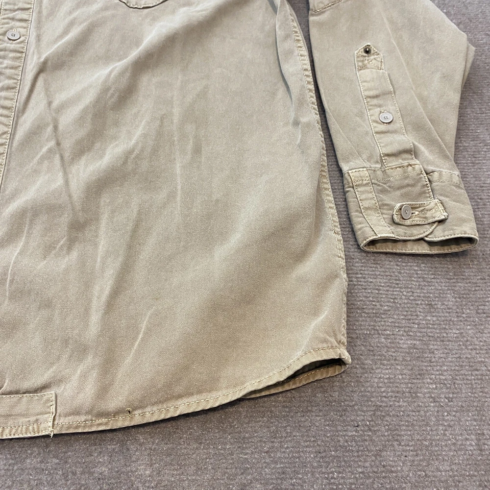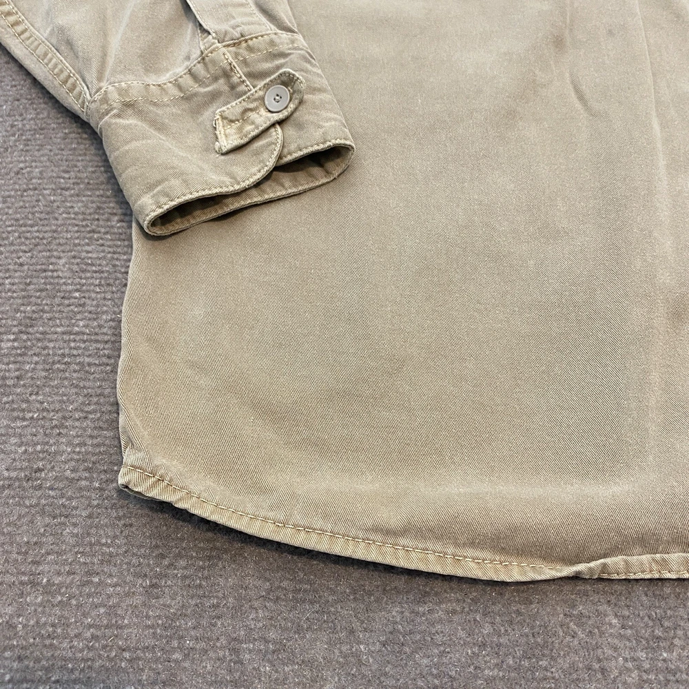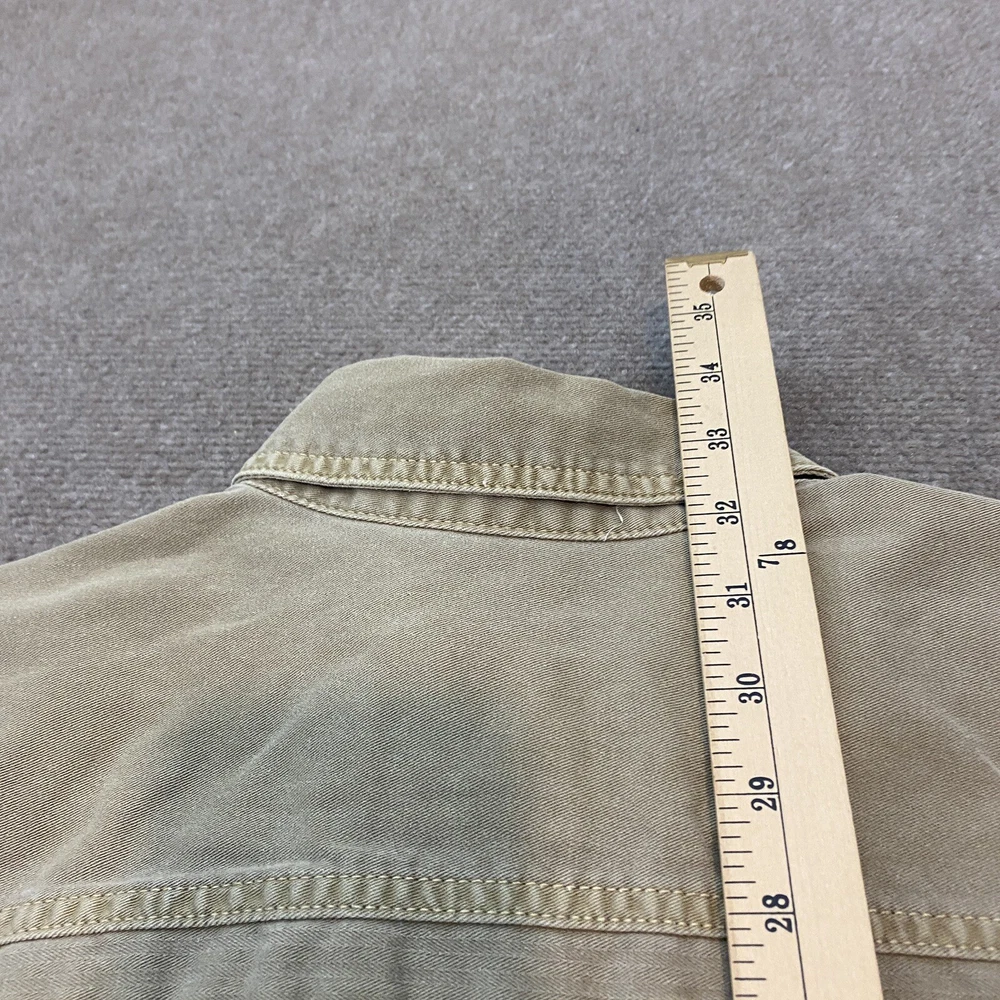 Shirt color is a shade between olive green and brown. The shirt has distressing on both sleeves and a pin hole on the bottom front hem line. Please see photos for details and actual measurements. Check out our store Retro-Lab Thousands of similar items. Shipping is set to automictically discount on orders of more than one. $1.50 for each item after the first. We do our absolute best to try and document and photograph any flaws in the items, in case we miss something we are happy to accept returns. 30 day free returns on all clothing items, for any reason. All returns are free to you, but expensive to us so please review the measurements prior to purchase. Item measurements are approximate and located at the end of the photos. Pre-owned clothing sizing can change due to washing and wear. Offers can not be combined with coupons. All Items will be shipped with a tracking # for your verification. We ship out daily, so you can expect fast delivery! If you have any questions at all please email us.