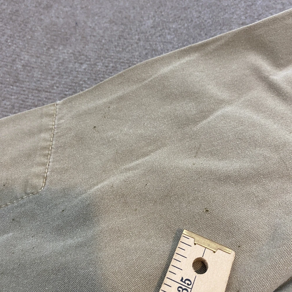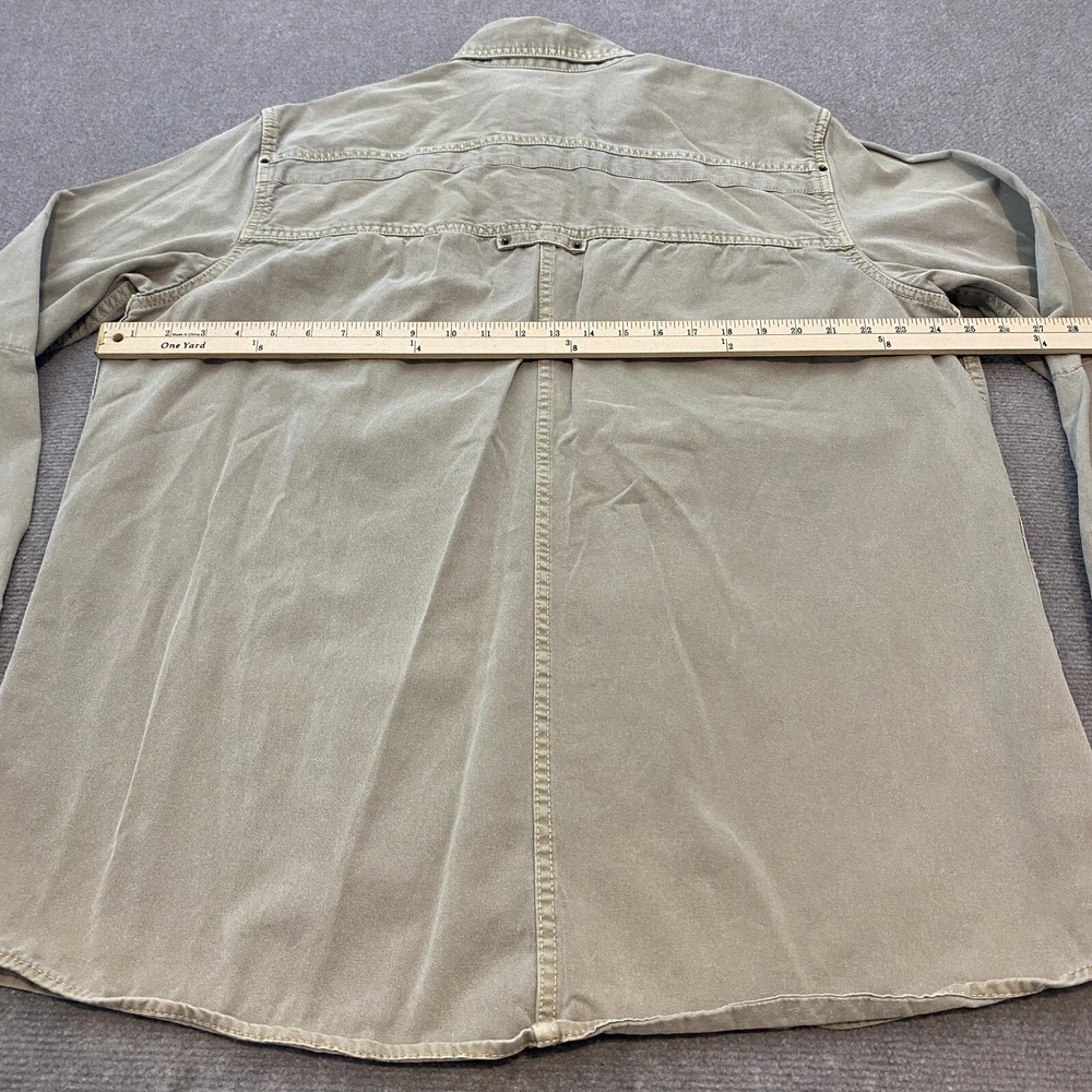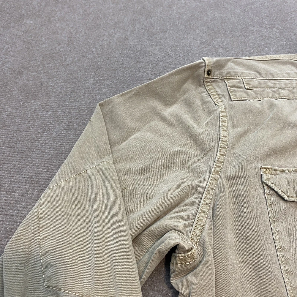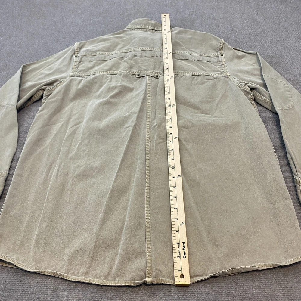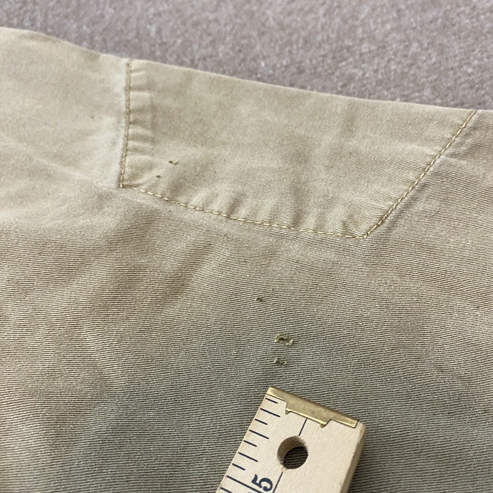 Shirt color is a shade between olive green and brown. The shirt has distressing on both sleeves and a pin hole on the bottom front hem line. Please see photos for details and actual measurements. Check out our store Retro-Lab Thousands of similar items. Shipping is set to automictically discount on orders of more than one. $1.50 for each item after the first. We do our absolute best to try and document and photograph any flaws in the items, in case we miss something we are happy to accept returns. 30 day free returns on all clothing items, for any reason. All returns are free to you, but expensive to us so please review the measurements prior to purchase. Item measurements are approximate and located at the end of the photos. Pre-owned clothing sizing can change due to washing and wear. Offers can not be combined with coupons. All Items will be shipped with a tracking # for your verification. We ship out daily, so you can expect fast delivery! If you have any questions at all please email us.