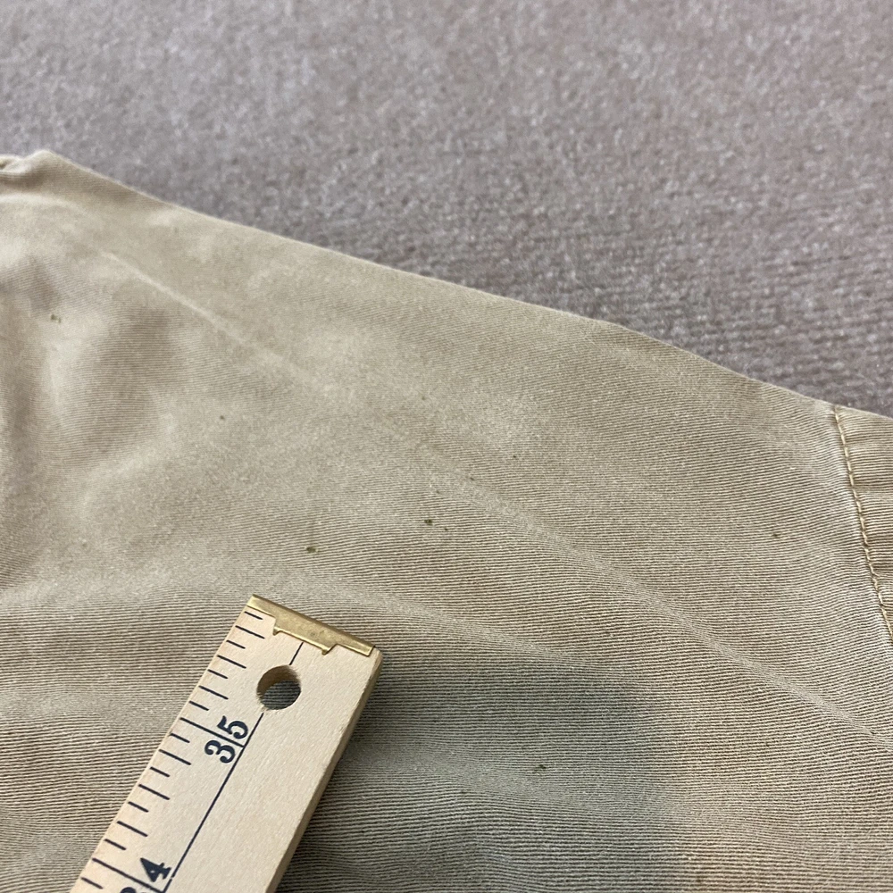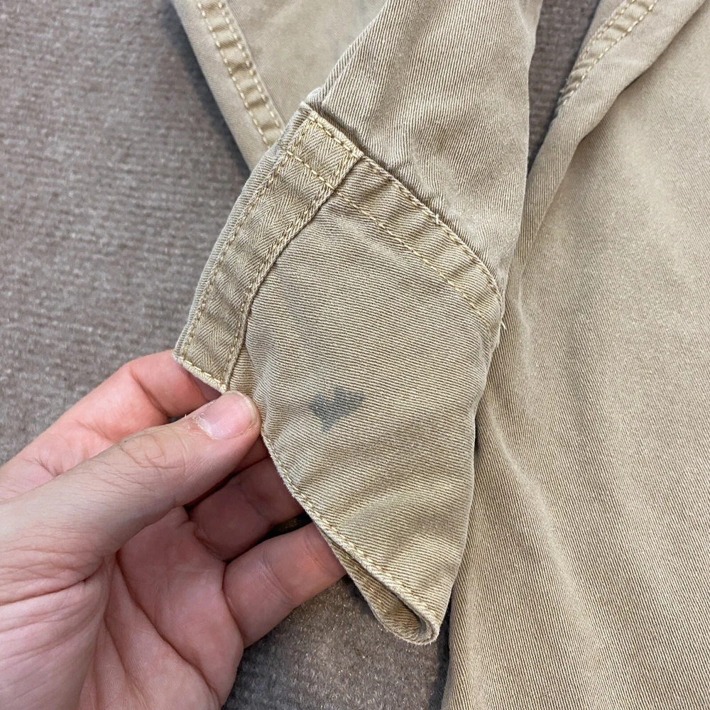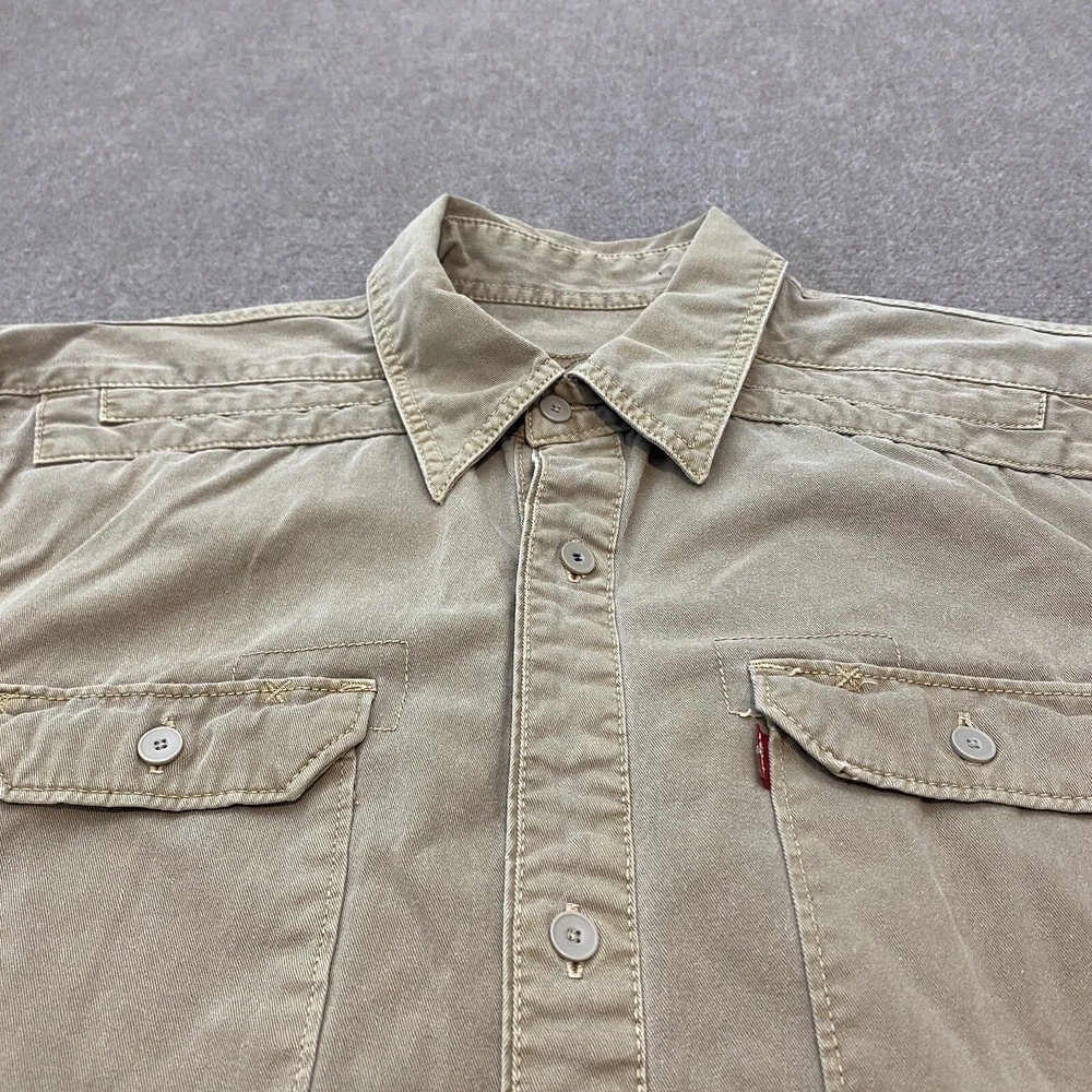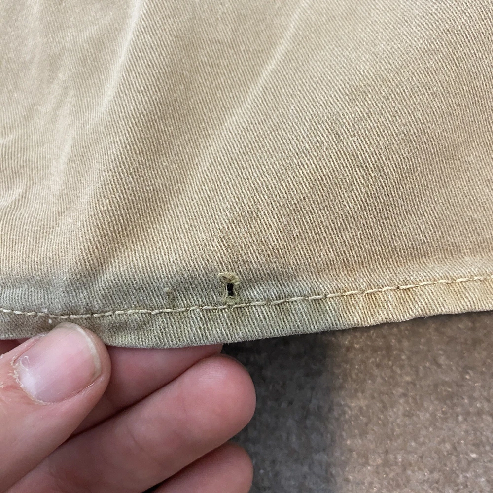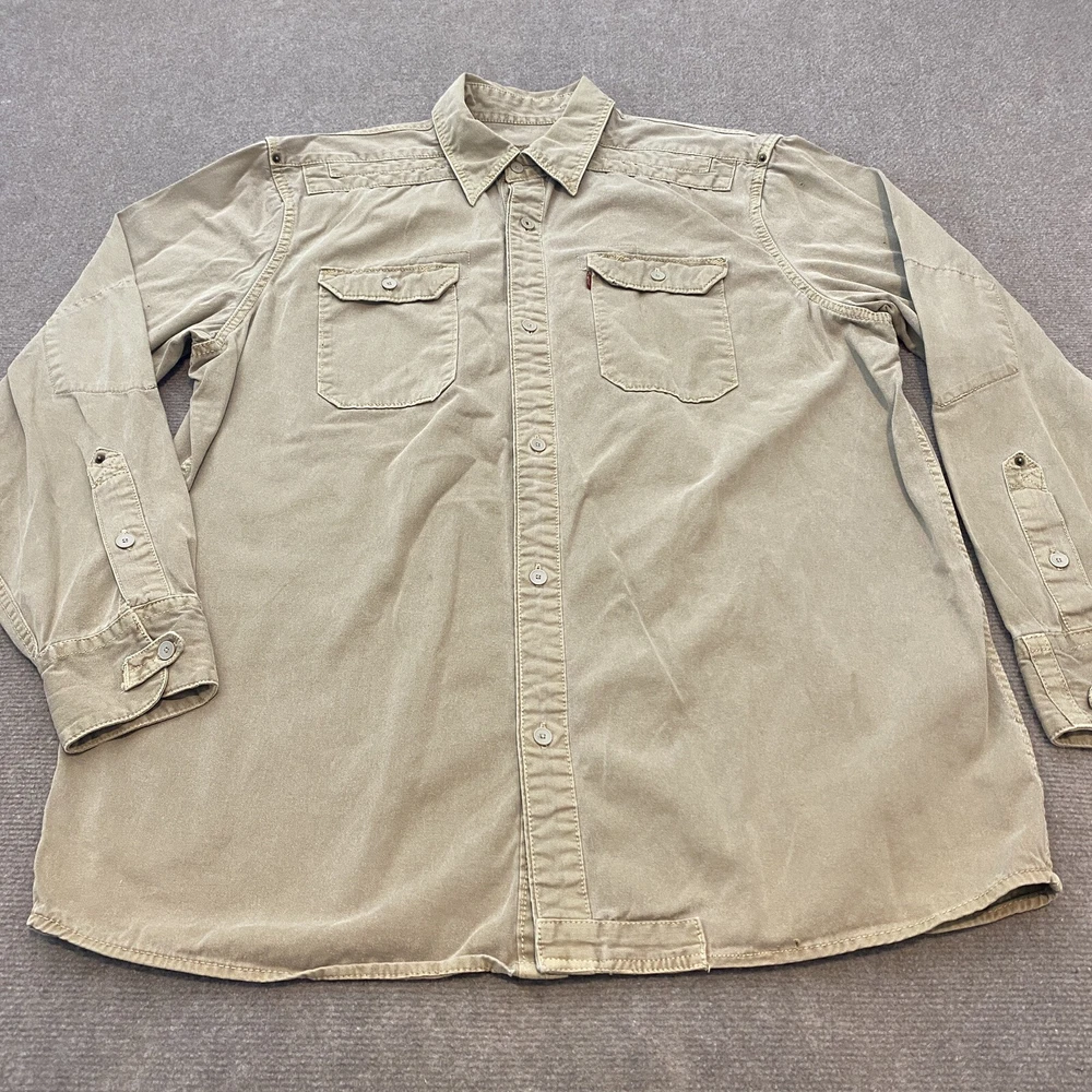 Shirt color is a shade between olive green and brown. The shirt has distressing on both sleeves and a pin hole on the bottom front hem line. Please see photos for details and actual measurements. Check out our store Retro-Lab Thousands of similar items. Shipping is set to automictically discount on orders of more than one. $1.50 for each item after the first. We do our absolute best to try and document and photograph any flaws in the items, in case we miss something we are happy to accept returns. 30 day free returns on all clothing items, for any reason. All returns are free to you, but expensive to us so please review the measurements prior to purchase. Item measurements are approximate and located at the end of the photos. Pre-owned clothing sizing can change due to washing and wear. Offers can not be combined with coupons. All Items will be shipped with a tracking # for your verification. We ship out daily, so you can expect fast delivery! If you have any questions at all please email us.