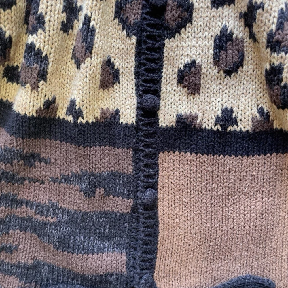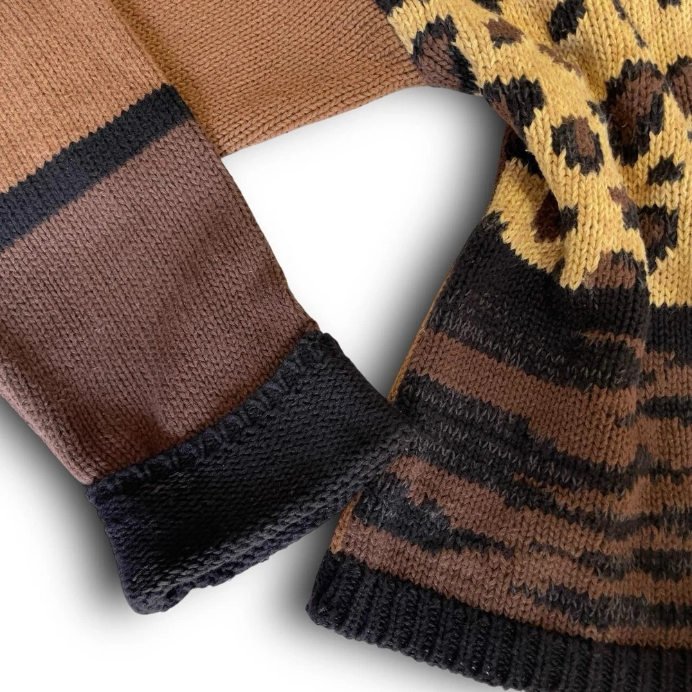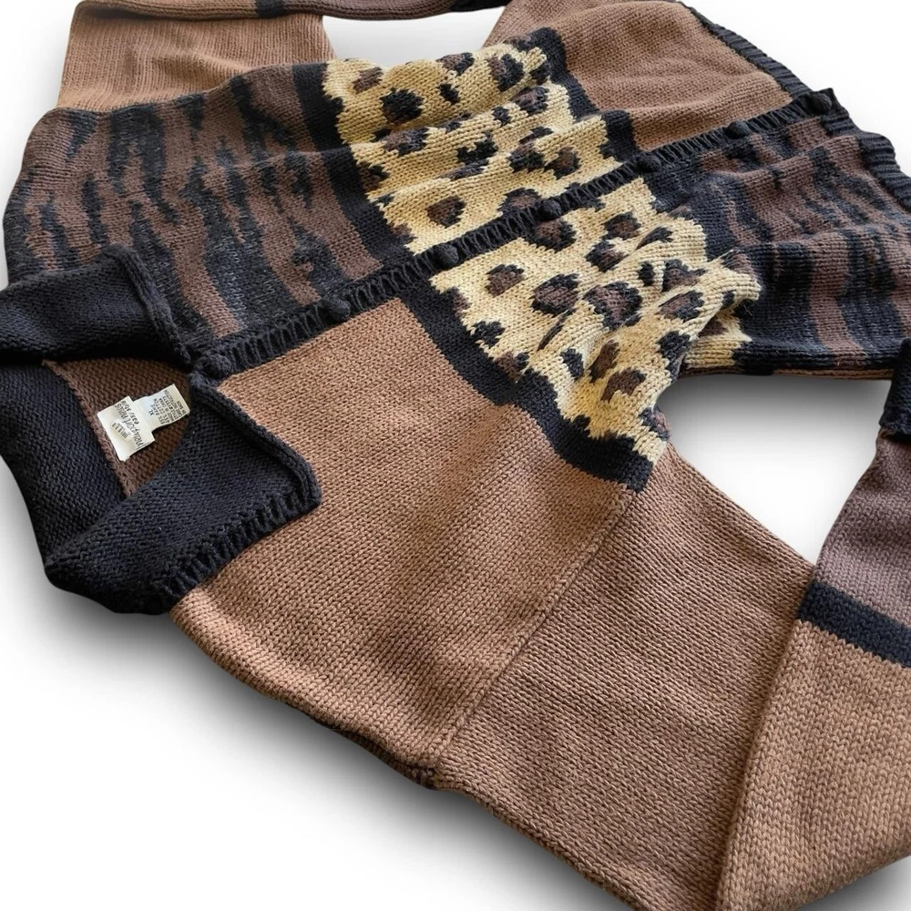 vtg animal print patchwork knit cardigan button up closure ~xl đđŚ 55% ramie 45% cotton vintage 80s 90s absolute precious oversized slouchy grannycore chunky knitted collared brown multicolor cardigan with long sleeves, folded cuffs & button up closure featuring crazy cool wacky leopard & zebra patchwork graphics along w/ retro stripe color block style allover in size xl. itâs giving jersey shore meets academia mob wife vibes⨠laid flat: chest 20â length 23â sleeves 20â vintage retro winter knits crochet animal print leopard zebra colorblock grannycore folklore muted cozy oversized multicolor chunky knit goblincore cottage farmhouse graphic bold fall urban grunge downtown pullover sweatshirt cardigan