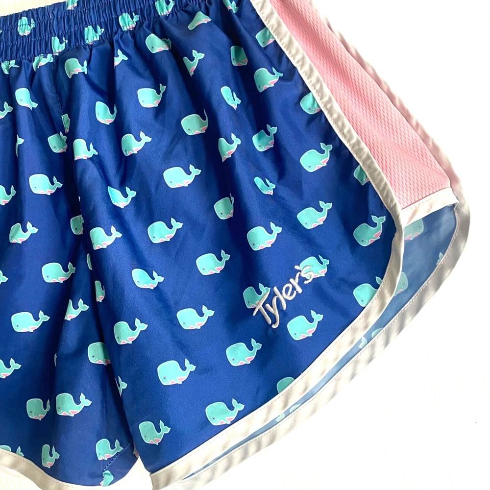 womens shorts size S small Tyler's store whale print running track athletic Pink shows slight fade. No stain or wash wear. Look very good overal. Tyler's is a popular shopping venue in Texas, and these were purchased on a visit to one of their locations. tyler's, tyler's store, Tyler's texas, running shorts, athletic shorts, size s, size small