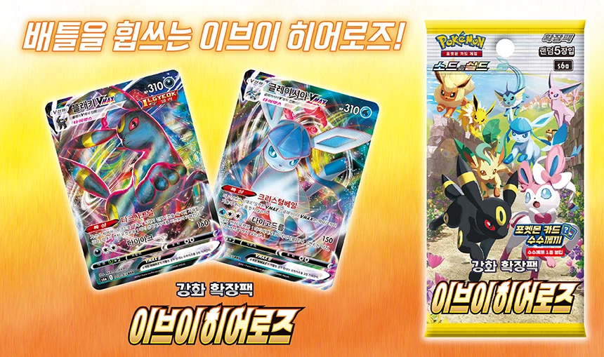 Pokémon TCG - Sword & Shield - Eevee Heroes [s6a] Booster Pack Brand NEW Factory SEALED Korean Version Card list includes the elusive "Moonbreon" Umbreon Alternate Art Secret Rare - e quivalent to the Evolving Skies English set DETAILS: Factory Sealed / Brand New Unopened factory sealed packaging x1 Pack Contains 5 Random Cards Each booster pack contains 5 random Pokemon TCG cards + 1 Quiz "Riddle Card" Cards are random as factory sealed. No guarantees for a specific card. This listing is for x3 booster packs. Please check the quantity of the items before purchasing! Ships within 1-3 working days.