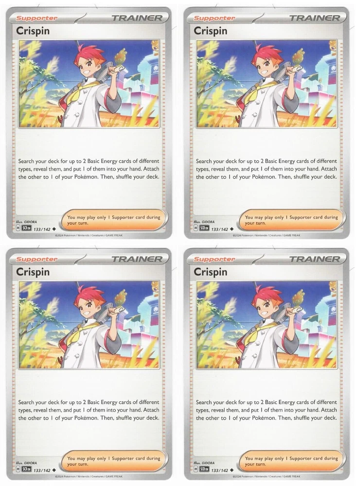 x4 Crispin 133/142 Stellar Crown Pokemon TCG NM/M Same Day Shipping Condition is NM/Mint. We package all our items carefully to ensure they arrive safely. Below is the procedure we use! Card Sleeves All individually sold cards, including EX's and rares, come in card sleeves. Team Bags The secured cards are then placed in team bags to protect from moisture and jostling. My Name is Samantha if you have any Questions feel free to Contact me!