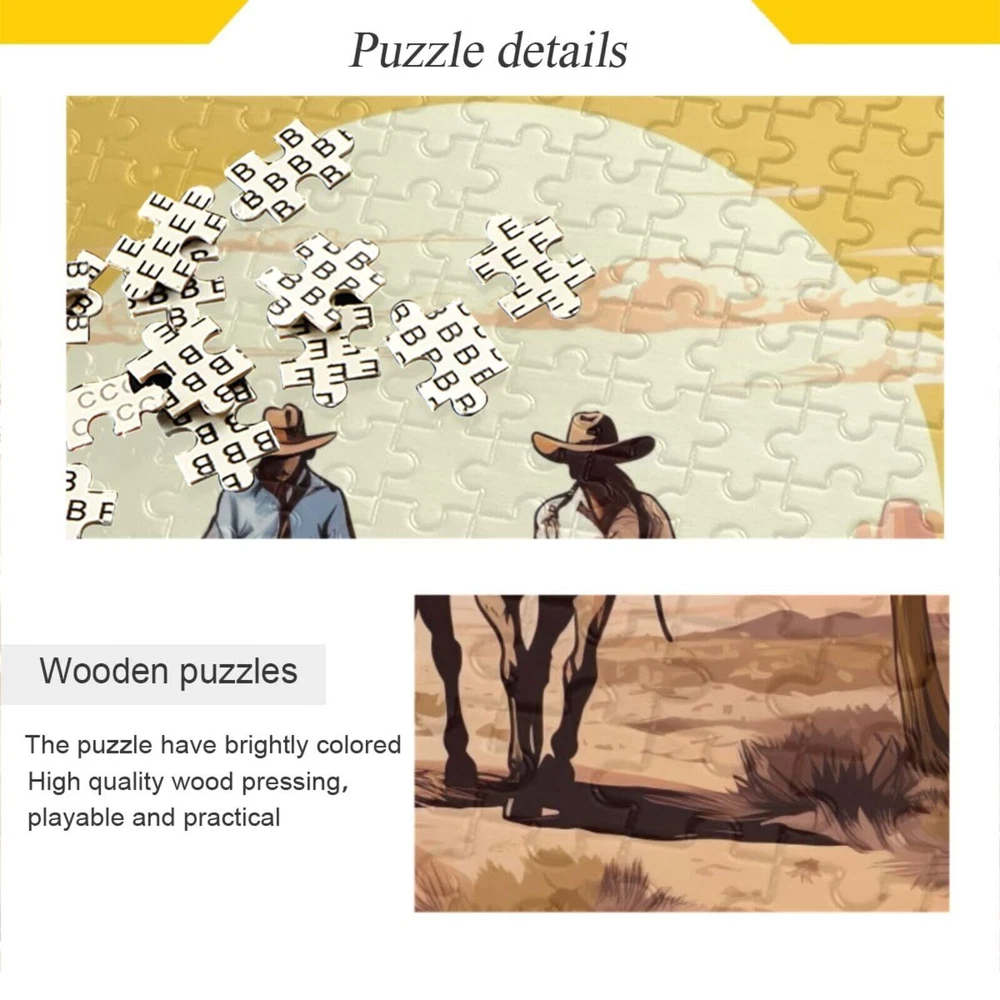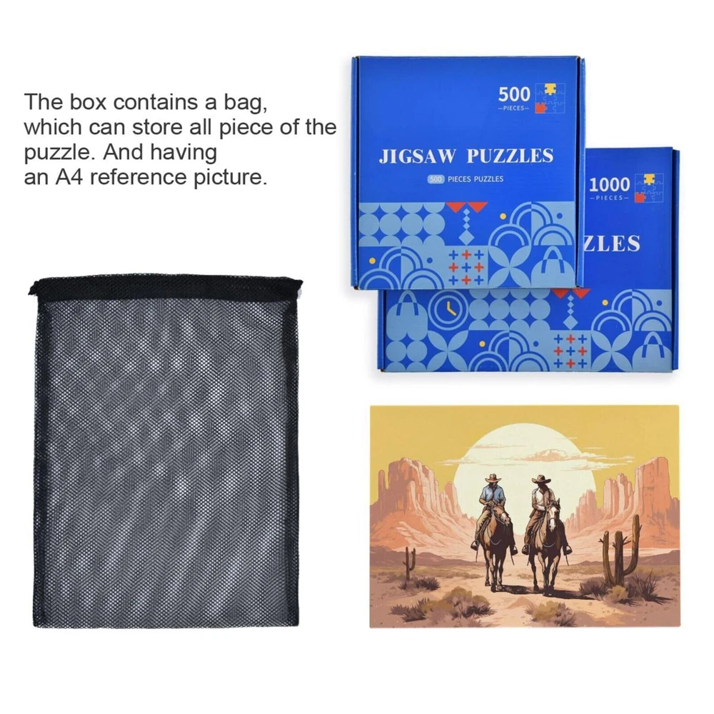 xigua Western Cowboy Puzzle 500 Pieces - Wooden Jigsaw Puzzles for Family Games - Suitable for Teenagers and Adults Art puzzles are fun and great games that can be used as puzzle games to enhance intelligence, develop hand-eye coordination and problem-solving skills, or to relax your mind and calm you down. It is a great game for family members, friends, team work building, etc. The uniqueness of Kigai jigsaw puzzles Kigai puzzles continue the advantages of previous puzzles and enhance them. Unlike traditional paper puzzles, our puzzles are made of paper and wood pressed together, the thickness is the same as a coin, the surface is smooth, the pattern color is firm, the picture quality is clear, the hardness is high, not easy to crack and deformation, more suitable for long-term preservation. The back of the puzzle is printed with the English alphabet, can be divided into blocks, according to the letters to spell, reduce the difficulty, you can work together with family, children, friends, spend happy time. SPECIFICATION Material: paper and wood pressed together Size: 500 pieces finished size: 20.5x14.9in/52*38cm 1000 pieces finished size: 29.5x19.7in/75*50cm Printing: clear printing on one side PACKAGING INSTRUCTIONS 1. Carton package size is 210mm*210mm*30mm,285*210*30mm. 2. The puzzle is divided into 6 or 8 pieces issued intact, not broken up state. ACCESSORY DESCRIPTION *Deliver a mesh storage bag and an A4 reference picture. CAUTION * As the puzzle is made of wood and paper, please avoid contact with water to avoid damage to the puzzle. * Made of raw wood, there are different colors of wood grain on the back, which is a normal phenomenon. *This product is made of wood, suitable for over 15 years old, children please use in the company of adults. MATERIAL: The puzzle is made of high quality paper and wood materials pressed together, safe and non-toxic, solid color, bright and clear surface, smooth texture, high hardness, not easy to crack deformation, can be stored for a long time, perfect for framing up as wall decoration after putting together. SIZE: 500 pieces of wooden jigsaw puzzle finished size is 20.5" x 14.9"/52x38 cm, the interface of the puzzle pieces is tight, strong bite, excellent texture, not easy to fall apart. With the English alphabet printed on the back, you can divide the pieces and spell according to the letters to reduce the difficulty. INTELLECTUAL CHALLENGE: If you want to enhance your brain power through some good intellectual games, constantly playing puzzles can make your brain stronger and more flexible, and make you stand out in the crowd. RECREATION: Puzzles are one of the best indoor activities today. Playing with puzzles can calm you down and relax your mind. Of course, it can also provide hours of recreation for your family and friends, putting together this extraordinary puzzle, you can personally appreciate the beautiful artwork, and be sure it will be a memorable part of your memories. GOOD GIFT: We make sure you can put the puzzle together completely, if there are missing pieces, please don't get frustrated, contact us promptly, we will solve the problem and get your satisfaction. Stylish and beautiful wooden puzzles are perfect for entertaining your family, kids and friends during most holidays and festivals, such as Christmas, Thanksgiving, birthdays and parties, etc. Shipping from the USA All of our products are shipped from the USA, ensuring quick delivery to your destination. Payment We offer the following payment methods: PayPal, credit card, bank transfer, and eBay's secure payment system. Free Shipping & Free Returns Shipping within the USA is FREE. Additionally, any return is absolutely free for you. Risk-Free Purchase You have the option to return an item within 30 days without any justification. We cover the return shipping costs! Fast Shipping We ship immediately upon receipt of payment. Generally, the package is delivered within 2-3 days in the USA. If it takes longer, we will contact you. Quality and Costs Made in Europe, USA, China No customs fees or additional charges Total satisfaction guarantee Invoice with declared VAT available upon request in .pdf format Feedback Your feedback is very important to us. After you pay for your purchase, you will automatically receive positive feedback from us.