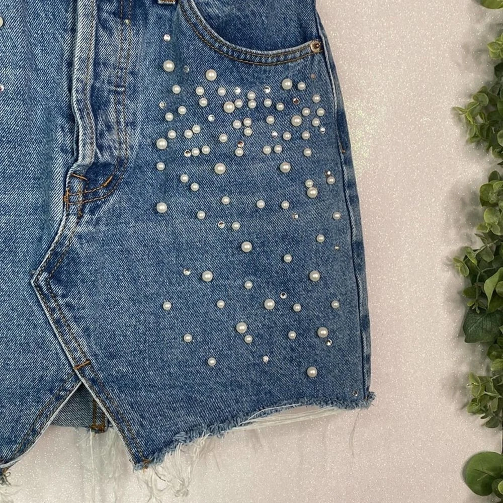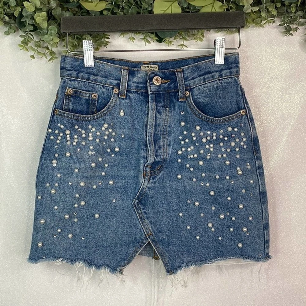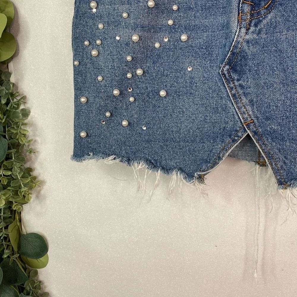 y2k Top Trends Distressed Denim Mini Skirt w/ Pearls - size 36