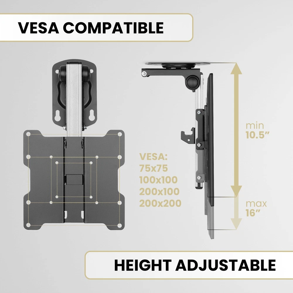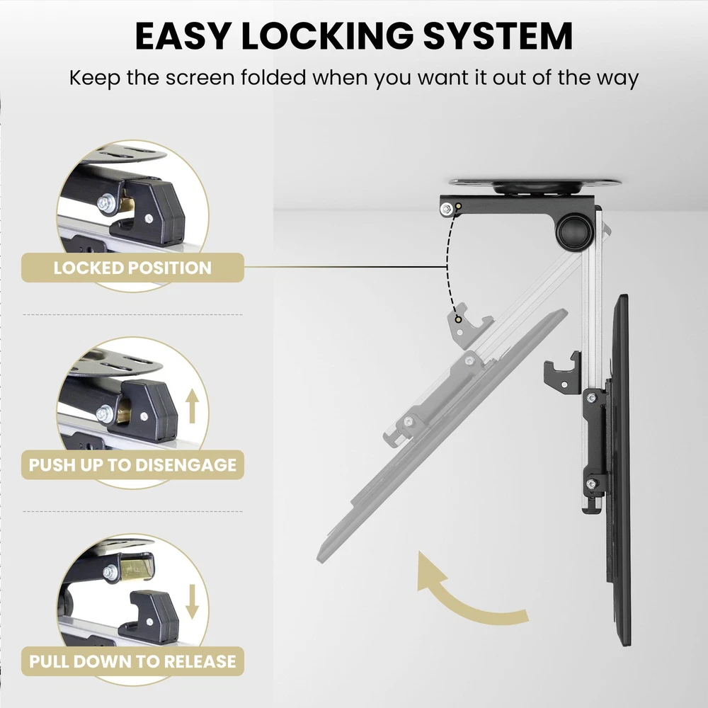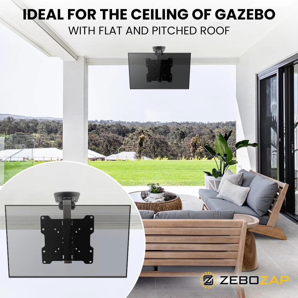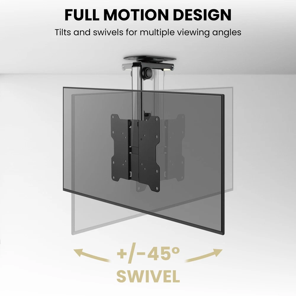 FOLD UP Ceiling TV Mount, for Flat Ceiling, Pitched Roof, Under Cabinet and Corner Installations, Support Most 17''-37'' Monitors up to 20kgs/44lbs Transform Your Outdoor Space - Experience outdoor entertainment like never before with our innovative Flip Down TV Mount. Elevate your gazebo, pergola, or patio into a captivating entertainment hub under the open sky. Sleek & Versatile Design - Seamlessly blending into any outdoor setting, our Flip Down TV Mount adds elegance to your space. The black powder-coated finish ensures durability, even in harsh conditions. Turn your patio into a sophisticated outdoor theater that impresses your guests. Unparalleled Flexibility - Tilt, swivel, and rotate your TV effortlessly for the perfect viewing angle. Whether hosting a lively BBQ party or enjoying a quiet evening under the stars, our robust articulating arm ensures smooth movement, so every seat has a great view. ADD TO CART now. Easy Installation, Universal Compatibility- Our Flip Down TV Mount includes a comprehensive installation kit and instructions, making setup a breeze. With universal VESA compatibility, it confidently fits most TV models, allowing you to mount your desired screen size with convenience. Weatherproof & Durable- Crafted from weatherproof aluminum alloy, our mount withstands the elements, ensuring long-lasting performance. Don't settle for less when it comes to outdoor durability and reliability. Trust our Flip Down TV Mount to deliver outstanding results. Heavy-duty Capacity, Peace of Mind - With a robust weight capacity of up to 44 pounds (20 kgs), our mount securely holds a variety of TV screens. Enjoy your outdoor entertainment without worrying about stability or safety concerns. Invest in quality and enjoy peace of mind. Height Adjustable & Space-saving - The mounting plate offers a height adjustment capability of up to 5.125 inches, allowing you to achieve the perfect viewing position. Maximize your space by folding up the TV mount when not in use, keeping your outdoor area clutter-free