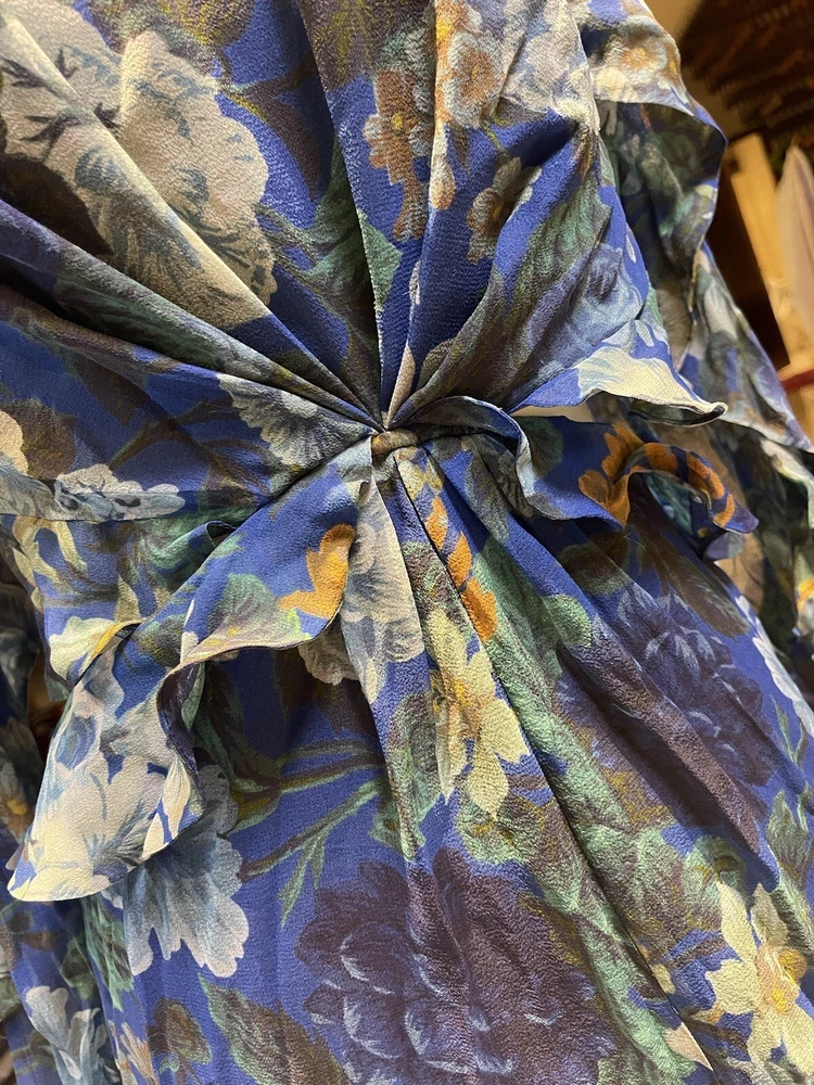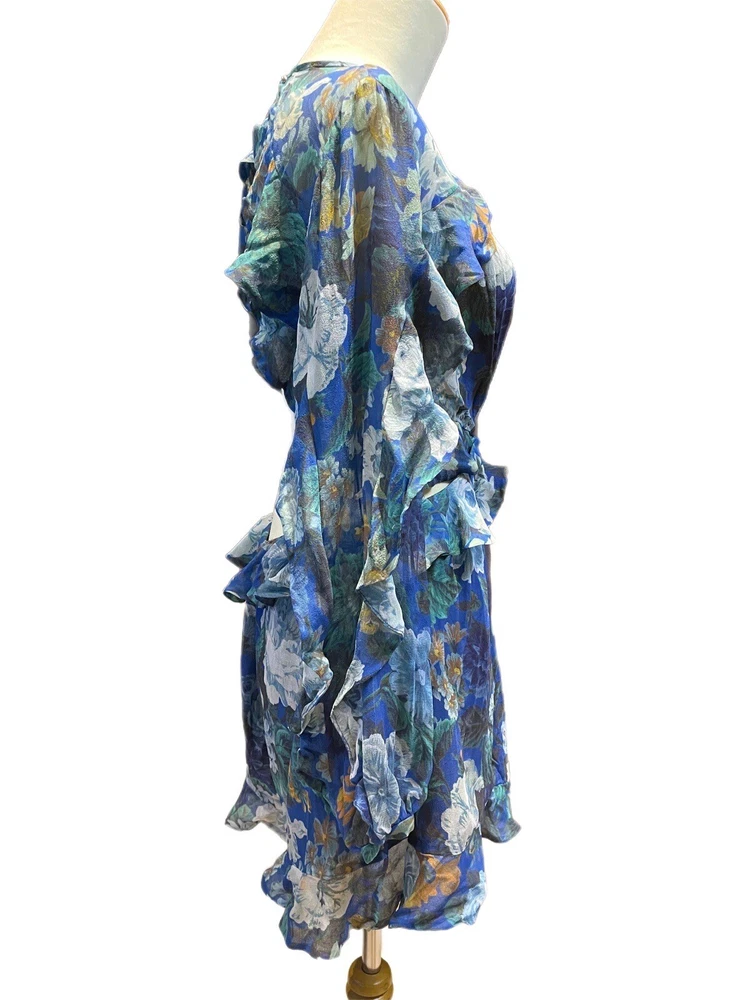 This Zimmermann dress is a pre-owned size 2 made from 100% silk with a blue colour. The dress features a long balloon sleeve, round neck, button closure, and ruffle accents. It has a fit and flare style with a drop waist and is perfect for various occasions such as travel, weddings, holy communion, parties, and more. Additional features include a backless design, side zipper, and lightweight feel. The dress is lined and has a fabric type of rayon. It's a great addition to any wardrobe with its designer, beach, classic, and fun themes. Made in Australia, it's suitable for all seasons and can be dressed up or down for casual or formal events.